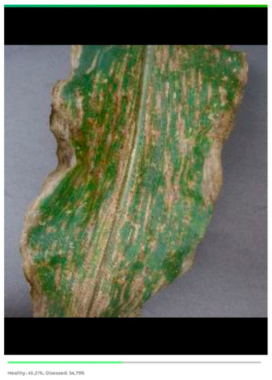 By varying the threshold slider, the diseased leaf tissues were covered in blue. The results were obtained by clicking a tick on the upper right corner of Figure 16. Figure 17 shows how the results were displayed for the healthy regions and diseased regions. As mentioned previously, an inexperienced user, who might not be a pathologist, may not understand the interpretation of the disease severity if it is only displayed in percentage. As shown in Figure 7, it can be seen that our proposed method has a capability of rating the percentage of infections as “Low severity”, “Medium severity”, or “High severity”. For instance, if our proposed method would have been used to interpret the results shown in Figure 17, the diseased leaf area of 54.79% would have been estimated as “High severity”. As mentioned previously, it has to be remembered that the fuzzy logic scale ratings that were used in this study were chosen based on advice that was given by the experienced pathologists at ARC (Agricultural Research Council), South Africa.