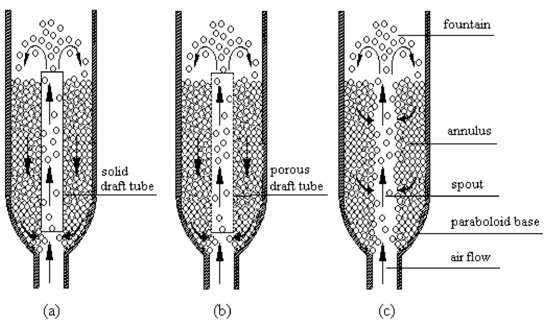 Spouted bed technology in solid–gas systems [3] has proven to be an effective contacting way for gas and coarse solid particles, such as Geldart type D particles [4]. By far, drying of coarse and heat-sensitive granular materials has been the most well-known application of spouted beds. Agricultural products, wood chips, and various polymeric materials are some of these granular materials. In spouted beds, a high air temperature is permitted because of the agitation of solids, and so rapid drying occurs without the risk of thermal damage. A spouted bed is similar to a fluidized bed. However, in a spouted bed fluid moves through the spout region using a nozzle rather than a porous distributor as in the fluidized bed. The essential characteristics of spouted bed are comprised of the spout zone with solids moving upward by co-current gas flow and the downcomer zone with solids moving downward by counter-current gas flow [5]. A comparison between fluidized bed and spouted bed drying for seeds revealed that fluidized bed dryer had a faster drying rate, while a spouted bed dryer was better in terms of lower specific energy consumption [6]. In an operation like solids drying, use of porous draft tubes in a spouted bed helps in the lateral transport of hot air from spout to annulus region, thereby providing better contact between solid and fluid phases in the annular region as well [7].