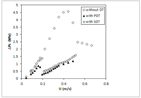 Bed pressure drop–air velocity curves for PBSB without and with solid and porous draft tubes.