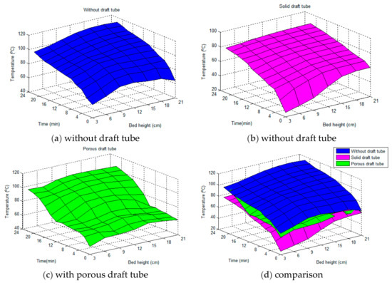 Temperature distribution along the bed height in the annular region (r = 0.004 m) during drying of paddy is shown in Figure 4 without draft tube and with solid and porous draft tubes. Temperatures at eight points along the height of the column were recorded during the whole drying process, which caused reduction in moisture content of paddy. According to the simulated results obtained in the literature, grain and air temperatures approached equilibrium within a few centimeters upstream from the inlet [10]. Therefore, temperature measurements should represent the grain temperature. As can be seen, paddy temperature decreased during the downstream movement in the annulus for all cases. A similar result was observed by [12]. Figures show that, heat-up in the spouted bed without draft tube was more rapid. This implies more efficient contacting in the spouted bed. The solid draft tube prevented radial gas percolation from the draft tube to the annulus. After twelve minutes of paddy drying, bed temperatures (at H = 14 cm, r = 4 cm) were 100, 83, and 70 °C for SB without draft tube, with porous and solid draft tubes, respectively. As can be seen, higher air temperatures can be achieved for PBSB without draft tube. However, the minimum spouting velocity is also higher in this case. Consequently, this will affect adversely the process efficiency. The curves show that air temperature increased with the drying time and also with the axial position in the annular region. However, especially at the progressive drying times, no pronounced difference in temperatures at different axial positions for the solid draft tube spouted bed was observed. This will adversely affect efficiency.
