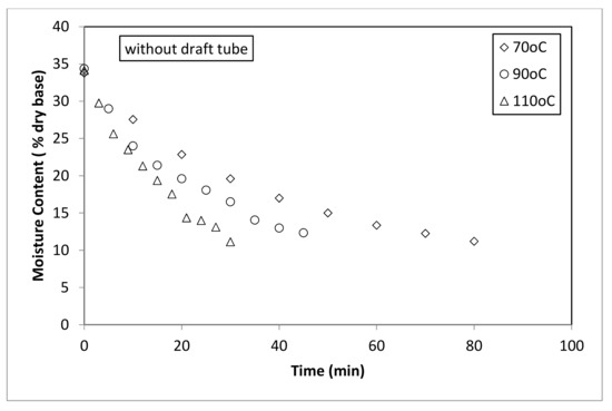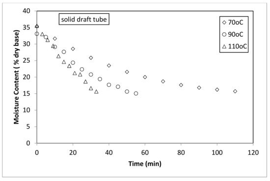 Drying curves for PBSB drying of paddy without draft tube, with porous and solid draft tubes are shown in Figure 5, Figure 6 and Figure 7, respectively. The drying process is characterized by a progressive decrease in moisture content with time. The change in moisture content with time follows the exponential decay, implying that the internal resistance controls the moisture content. Air temperature is an important factor influencing the drying rate. Effect of air temperature in the range of 70–110 °C on SB drying of paddy is significant in these figures for all drying conditions. Drying time increased with the decreasing air temperature. A sharp decrease occurred in moisture content at 110 °C. While moisture content of paddy reduced to 11.13% db after 30 min of drying in PBSB without draft tube at 110 °C, it reduced to 16.5 and 19.6% db at 90 and 70 °C air inlet temperatures for the same drying time, respectively (Figure 5). The required length of drying time to dry the paddy to moisture content below 15% db could be reduced by 60% using a temperature of 110 °C instead of 70 °C for PBSB without a draft tube.