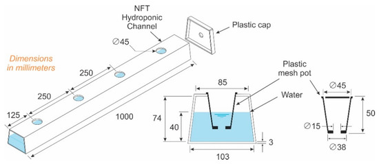 The virtual NFT hydroponic system relied on commercial polyvinyl chloride (PVC) channels for lettuce production. Figure 1 shows the NFT hydroponic system dimensions. The overall channel dimensions were 1000 mm (length) × 103 mm (width) × 74 mm (height). The channel’s walls were 3 mm thick. The dimensions of the plastic hydroponic mesh pot were 50 mm (height) × 45 mm (diameter). In addition, two plastic caps were included. The study used computer-aided design (CAD) to model the virtual NFT hydroponic system. The design parameters were obtained and are shown in Figure 1. The virtual NFT hydroponic system was designed to be used with plastic mesh pots and caps. In addition, inlet and outlet flow ducts were placed at the center of each plastic cap.