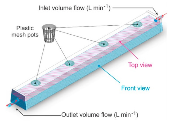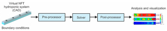 Computational fluid dynamics (CFD) is progressively becoming a design-oriented tool in many engineering fields to solve and predict engineering problems that involve liquids and gases [7]. CFD has several attractive features: (a) easy variation of flow parameters, (b) fast changes to the geometry, and (c) detailed insight into flow behavior. CFD has proven to be accurate and beneficial in many engineering fields, including aeronautics [8], engine modeling [9], heat exchanger design [10], cooling systems [11], and wind turbines [12]. However, few studies have addressed CFD in NFT hydroponic systems. Bougoul and Boulard investigated the dynamics of water and nutrients in rockwool slabs that are used as growing substrates for sweet pepper crops [13]. They used CFD to solve the water movement equations numerically in three dimensions. Niam et al. proposed the design of a root-zone cooling system using CFD [14]. They conducted simulations to find the optimal distance between coolant pipes considering a uniform temperature distribution.