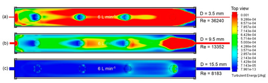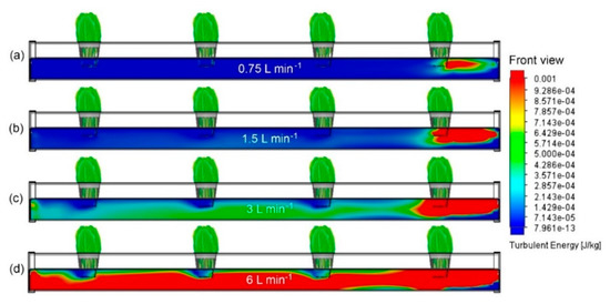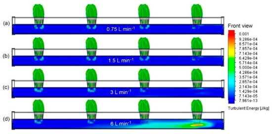When comparing Figure 4, Figure 5 and Figure 6, turbulent kinetic energy decreased around the plastic hydroponic mesh pots when the pipe diameter was increased (15.5 mm). In contrast, turbulent kinetic energy increased when the pipe diameters were decreased (3.5 and 9.5 mm). Notice that only Figure 5a and Figure 6a,b showed 2.857 × 10−4 J kg−1 of turbulent kinetic energy around the plastic mesh pots. Figure 7, Figure 8, Figure 9 and Figure 10 show the turbulent kinetic energy distribution using the four constant inlet flow rates.