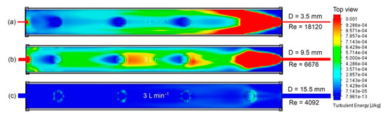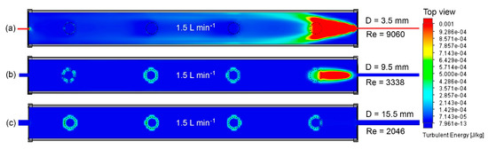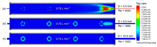 The proposed inlet pipe diameters and flow rates were set to 3.5, 9.5, and 15.5 mm and 0.75, 1.5, 3, and 6 L min−1, respectively. The pipe diameters were selected based on the commercial NFT hydroponic hoses available on the market [17]. The flow rates were selected taking into account previous studies proposed in the literature [4,5,6]. Figure 4, Figure 5 and Figure 6 show the turbulent kinetic energy distribution using the three constant inlet pipe diameters.