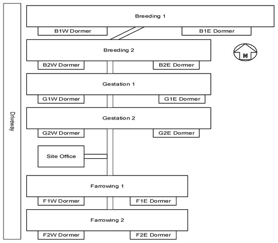 Typical layout of the breeding-gestation-farrowing sites included in the study for objectives 1 and 2. Each site had a slight variation of this layout, including driveway side and farrowing buildings on the north side. The diagram is not to scale.