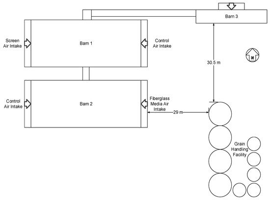 Data for objectives 1 and 2 were collected from eight commercial breeding-gestation-farrowing sites located in central Iowa. Each site contained six buildings, all orientated east to west, consisting of two farrowing buildings and four breeding/gestation buildings. Sites varied as to which buildings were on the north side (farrowing or breeding-gestation) and whether the driveway was on the east or west side (Figure 1). For objective 3, a commercial 3-building gilt development unit (GDU) was utilized with close proximity to row crop fields and a grain handling facility. Of the three buildings on the site, buildings 1 and 2 were utilized in the study and measured 37 m (W) by 84 m (L). Buildings 1 and 2 had air intakes on the east and west gable ends of the building. The distance between the east air intake of building one and the grain bin to the east was 29 m (Figure 2). All sites utilized a positive-pressure filtered ventilation system. Fresh air entry for each building was via two dormers extended off the side of the barn or each (two) gable end. For both designs, fresh air was pulled through an adjustable inlet curtain, evaporative cooling pad, filter bank (consisting of primary and secondary filters) and by a bank of variable speed fans. The variable speed fans exhaust pressurized the attic of the building, from which the air was distributed into the human- and animal-occupied zones through ceiling inlets. Air was exhausted from the building on the opposite side of the building from the dormer through shutters with an adjustable baffle to control the exhaust area opening. Each building had two dormers, one on the east and one on the west half of the building. The filter bank in the dormers consisted of a vertical filter wall with 6 rows of filters, thereby resulting in a floor-to-ceiling height that averaged 4.57 m (15 ft). The number of columns in each dormer varied depending on the barns capacity resulting in dormer lengths that ranged from 18.3 m to 23.2 m (60 ft to 76 ft) with a range of 144 to 216 filters. Each filter bank utilized MERV 15 v-pocket secondary filters with either a synthetic media with electrostatic charge or fiberglass media, 0.61 m by 0.61 m by 0.30 m (24 in. by 24 in. by 12 in.) with a high capacity MERV 8 primary filter with a fiberglass media, 0.61 m by 0.61 m by 0.05 m (24 in. by 24 in. by 2 in.) (Figure 3). All primary filters in the study met the same specifications previously mentioned. The primary filter brands varied only in the quality of manufacturing of the cardboard frame, pleating and gluing of the media to the cardboard. The primary and secondary filters time in operation of site ranged from six months to one week at the time of the study.