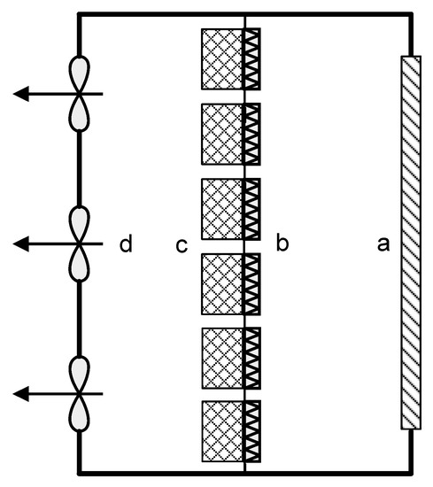 Top view of building air intakes with a straight filter wall. Air moves right to left, with the evaporative cool cell on the right (a), the primary (b) and secondary (c) filters in the center and the low pressure, high volume axial fans (d) on the left. Note the diagram is not to scale.
