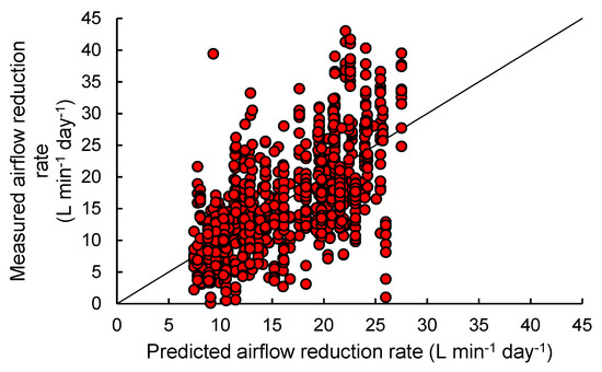 Total airflow reduction for all factors from the breeding-gestation-farrowing sites for objectives 1 and 2 observed in the study and the predicted airflow reduction per sow for an 800 head gestation barn with 312 filters (similar to the gestation barns in the study).