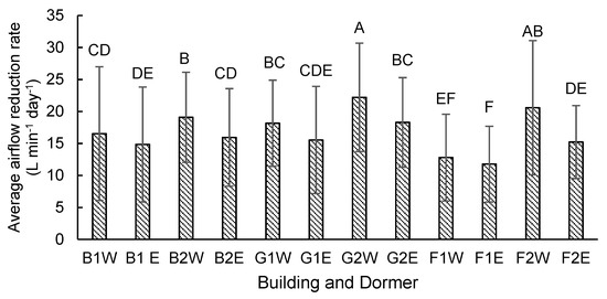Barn and dormer average airflow reduction from the breeding-gestation-farrowing sites for objectives 1 and 2. Error bars represent one standard deviation. Bars not connected by the same letter are significantly different α = 0.05. Refer to Figure 1 for the building and dormer location represented as the x-axis codes. The barns are: Breeding 1, Breeding 2, Gestation 1, Gestation 2, Farrowing 1 and Farrowing 2; each barn has an east and west dormer.