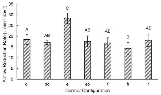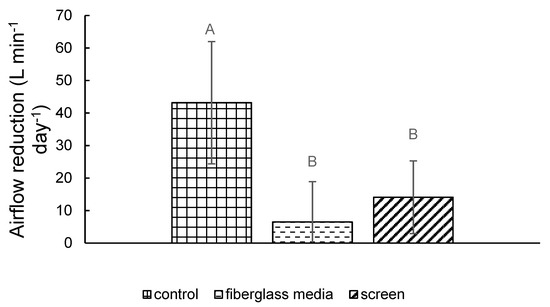 Airflow reduction rate from the gilt development unit (GDU) site for objective 3. The error bars represent one standard deviation. Bars not connected by the same letter are significantly different, α = 0.05.