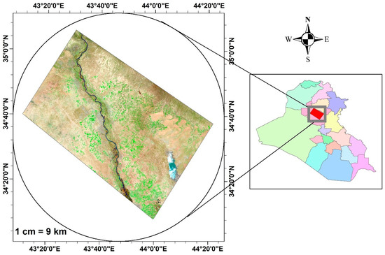 The study area is located in Salah Al-Din Governorate, about 180 km to the North of Baghdad, the capital of Iraq republic, between longitudes (43°00′–45°05′ E) and latitudes (34°00′–36°50′ N) (Figure 1). Topographically, it is a semi-flat area with the presence of some elevated local features represented by the deposits of river terraces and several depressions [7]. Geologically, most of the area is covered by Quaternary deposits (Pleistocene) including the alternation of sediments such as clay, sand, and gravel which belong to recent sediments, with an underlying Pre-quaternary (Tertiary) deposit represented by Mukdadiyah Formation (Pliocene), which consists of the alternation of sandstone, siltstone and claystone, and Injana Formation (U. Miocene). This consists of a sequence of silty, sandy, gravel and mud; all of these formations are suitable for groundwater storage. Tectonically, the area lies in the Stable and Unstable Shelf geotectonic units within the Mesopotamian zone, Ammara–Tikrit secondary subzone [26]. The study area is an important economic area, where the population depends economically on agriculture, especially crops of grain production, such as wheat, barley, and corn. Farmers depend on rainwater and groundwater as a source of irrigation to plant some summer and winter vegetables. Additionally, the areas of the two banks of the Tigris and the Al-Udheim rivers depend also on the water of these rivers for agriculture.