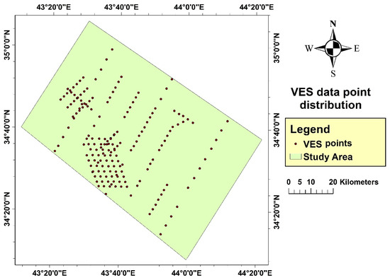 Geophysical methods are considered the most important techniques in groundwater and other hydrogeological explorations. This research includes collecting and analyzing vertical electrical sounding data provided by previous studies that were conducted in the study area [27,28,29,30]. The total number of VES data are 185 data point; Figure 2 shows the VES point distribution.