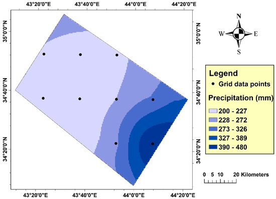 Remote sensing rainfall estimation based on satellite-derived data from the Tropical Rainfall Measuring Mission (TRMM) is a possible way of supplementing rain gauge data, with a good spatial cover [31,32]. Climate data for the period 2000–2017 based on satellite data were downloaded and processed with spatial resolution 0.25 deg. The data interpolated using the Ordinary Kriging method. The total annual precipitation ranged between 200–480 mm. Figure 4 presents the total annual precipitation based on TRMM_3B43 v7 satellite data per mm over December 1999–October 2017.