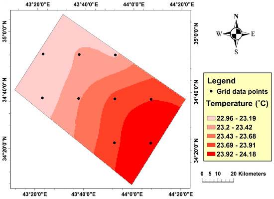 Figure 5 presents the average annual air temperature based on satellite data during the period 2000–2017, which were downloaded from GLDAS Model (NOAH025_M v2.1). The data, originally in the Kelvin unit (°K), were converted to Celsius (°C) and interpolated using the Ordinary Kriging method.