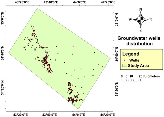The groundwater wells data were acquired from the General Commission for Groundwater/Ministry of Water Resources/Iraq. The total number of the data points are 340, each point contains pH, EC (µS/cm), K (ppm), Na (ppm), Mg (ppm), Ca (ppm), Cl (ppm), and SO4 (ppm). The distribution of the wells is shown in Figure 6.