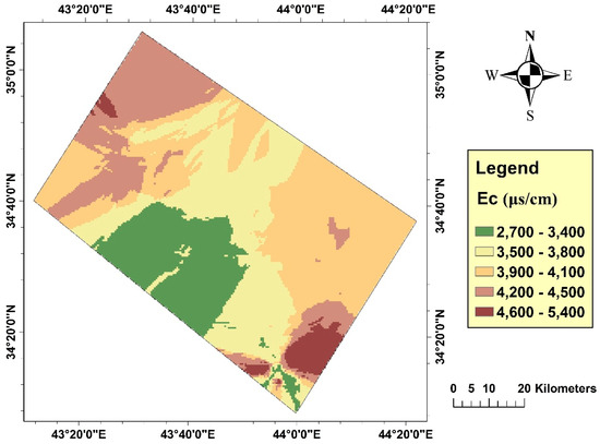 Thorne and Peterson in 1954 [40] modified the classification proposed by the US Salinity Laboratory in 1954 as shown in Table 1. For this study, the values of EC vary from 2700 to 5400 μS/cm, where all the values lie in the fourth category (very high salinity water). Figure 7 illustrates the interpolated EC value distribution in the study area using the Ordinary Kriging method.