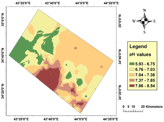 Water pH and redox potential significantly affect the chemical and biochemical processes in the water, therefore their determination has great importance. It helps to distinguish the presence of different forms of elements in water, which is one aspect of assessing the corrosive properties of water that affects the efficiency of most chemical, physical-chemical and biochemical processes of the water. The permissible limit prescribed by WHO varies from 6.5 to 8.1 with a mean value of 7.5 [42]. For this study, the average value of pH is 6.98, where all values lie in the range 5.93–8.54, indicating slightly alkaline water. The pH values distribution of the study area is shown in Figure 8.