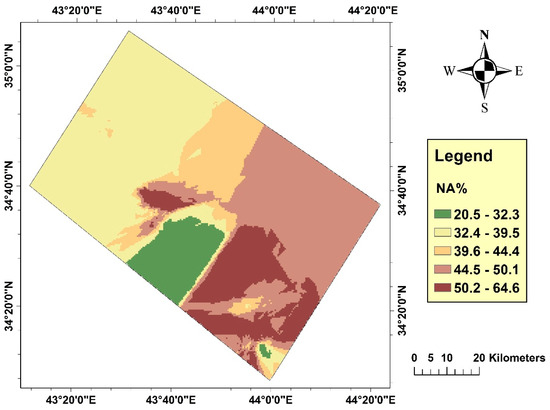 Table 3 illustrates the various classes of water based on Na% values. For this study, the values of Na% are computed using equation 6; the values lie in the range 20.5–64.6. These values are interpolated using the Ordinary Kriging method. Figure 10 illustrates the Na% values distribution in the study area.