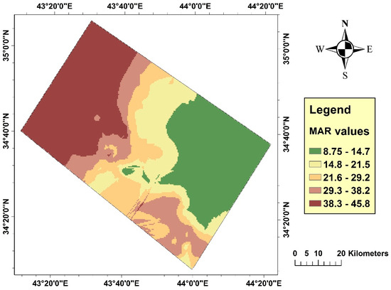 Interpolation map for Magnesium Adsorption Ratio (MAR) values of the study area.