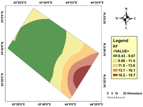 where Z is the total precipitations calculated for each year (mm) and the parameter T is the average annual air temperature in individual years (°C). Climatic regions, which are classified by this method, are shown in Table 4. For this study, the values of Kf lie in the range of 8.43 to 19.7; all the regions lie in the first category, which is a dry condition (irrigation required). A Lang factor (Kf) value of less than 20 indicates smaller possibilities of groundwater recharge during wintertime. The groundwater recharge is proportional to Kf, where the highest value refers to a location that is more suitable. Figure 13 illustrates the Kf values distribution in the study area.