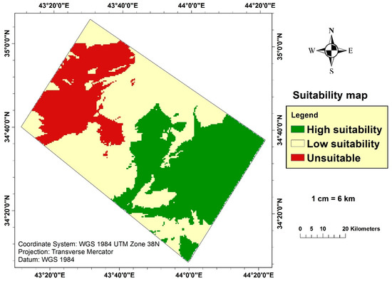In this study, GIS-based Multi-Criteria Decision Approach is used to identify suitable locations to use groundwater for irrigation purposes in Salah-Al-Din Governorate. Various criteria are adopted including Electrical Conductivity (EC), Power of Hydrogen (pH), Sodium percentage (Na%), Sodium Adsorption Ratio (SAR), Magnesium Adsorption Ratio (MAR), Kelly’s Ratio (KR), climate factor, aquifer thickness, and aquifer elevation. The criteria layers are assessed using the MCDA by combining them using the weighted overlay function in ArcGIS 10.5. Appropriate weights are assigned and integrated into GIS to create the groundwater suitability map for irrigation. The final suitability map is classified into three categories, high suitability, low suitability and unsuitable (excluded) as shown in Figure 17. In addition, the total area and percentage are determined for each class as shown in Table 6.