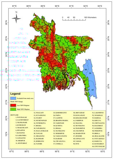 The MODIS VI products (MOD13A1) applied the maximum value compositing (MVC) technique to derive NDVI over a time period of 16 days for each observation. This data product utilized MVC technique to process MODIS data on a pixel-by-pixel basis for each from a total of 16 daily time series data value [64]. Eventually, the MVC approach enabled the users to obtain pixel-by-pixel cloud-free, quality images representing major changes in the crop properties, condition, as well development and growth of growing Boro crop at different stages of development during the Boro lifecycle. Furthermore the composite algorithm utilized the information in the reflectance quality assurance (QA) flags, particularly those derived from the MODIS cloud mask product, to preprocess the atmospherically corrected reflectance data of MODIS Bands 1–3, and 7 (red, NIR, blue, MIR) over land only where the land pixels with clouds, shadow, and bad data integrity were excluded from VI composite [65]. Besides MVC’s had the added advantage of reducing the effects of other unwanted influences on the NDVI values (such as atmospheric interference). An MVC NDVI image of the area provided pixel-wise NDVI values indicative of the condition of each pixel under observation. Pixel-wise spatial summation of NDVI values for all the individual pixels covering each individual district area in the MVC NDVI image provided a single value for each district. It has been reported that this MVC data product is known to be able to account for both background and aerosol effects [48,60]. The utility of the maximum value composite Image technique has been tested in a case study to generate NDVI over the Indian Subcontinent. The MVC technique minimized cloud contamination, reduces off-nadir viewing effects, and generated maximum value composite image. It has been widely reported by various researchers that MVC techniques remove most clouds and cloud shadows, offer high spatial coherency, and present middle-to-low sensor zenith angles in time series images. Besides standard NASA MODIS composite provides close to nadir observation angles, and good spatial coherency [66].