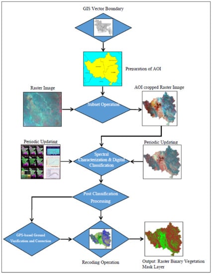 Methods of generating and updating raster binary vegetation mask layer. GIS: Geographic Information System; GPS: Global Positioning System. AOI: Area of Interest