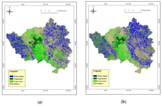 In this research work, spatial masking layers played an important role in obtaining information on seasonal crops like Boro rice as the calculated satellite-based NDVI values were influenced by the forests, homestead vegetation, as well as seasonal vegetation other than Boro crop. Digital identification and separation of surface features under different categories of vegetation and non-vegetation is the initial step in this operation. Table 2 provides a list of surface feature categories contributing to the pixel-wise ultimate radiative response values determining the NDVI magnitude of that particular pixel. These feature elements had specific roles in determining the pixel-wise NDVI calculation. At this stage, a spatial masking operation was carried out in the ERDAS Imagine platform using previously prepared vegetation mask layer. In preparing the vegetation mask layers, a number of vegetative surface features were considered. The vegetation mask layer includes (i) forest features, (ii) homestead vegetation together with (iii) seasonal crops, and (iv) mostly non-vegetated soil areas. The purpose of the vegetation mask was to screen out part of vegetation which was mostly stable or having unchanged cover for relatively longer time period. The basic approach consisted of producing a vegetation mask layer to facilitate the process of separating the forest and vegetation layer. Vegetation mask layers were generated from high-resolution satellite data and were utilized to find the district-wise rice pixel only in present study. Regular updating of these layers in every 3–4 years period seemed to be satisfactory to obtain the updated surface features at country scale. The spatial details used moderate high-resolution satellite images with a spatial resolution of 5 m or so, on which the temporal dynamics of the crop, as demonstrated through NDVI, was taken into account by supplementing with high resolution images with less frequent observation. Some information on the satellite data, along with relevant characteristics/parameters, are given in Table 2. Increasing vegetation density enhanced the NDVI values for a given crop area. While decreasing vegetation gave rise to reducing NDVI values over evolving crops and other surface features. The detailed method of generating and updating spatial vegetation mask layer is illustrated in Figure 2. However, the changes in the mask layer feature (Figure 3a,b) for smaller area coverage (Madhupur tract) are illustrated in Table 3 to show the low variations from the 2011–2017 time period.