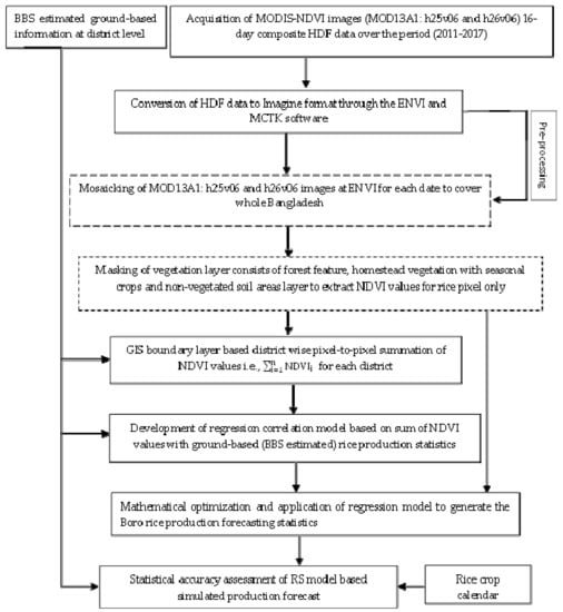 A comprehensive methodological step for this study has been illustrated in Figure 4. After acquisition of these satellite images, multiple steps of pre-processing were performed to develop rice production forecasting methods, likely (a) conversion of HDF format dataset into image compatible format through (MODIS Conversion Tool-kit) MCTK and ENVI software; (b) re-projection of the NDVI images into Transverse Mercator; (c) necessary geometric correction; and (d) digital mosaicking of the collected images (MOD13A1: h25v06 and h26v06). The geometric and geo-referencing operations of Landsat TM imageries of the study area to ensure proper geometric matching of different surface features in time series images were performed using Ground Control Points (GCP) of the area as collected by the ground truth team of SPARRSO using Global Positioning System (GPS) by following standard methodology as available in ERDAS Imagine Image Processing software [71]. Besides, the MODIS VI products (MOD13A1) was atmospherically corrected and modified by MVC techniques which addressed the atmospheric perturbation.
