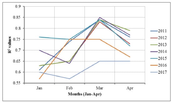 The regression coefficient during (2011–2017) shows strong positive relationships that are similar to other studies [82]. This coefficient value from individually developed twenty-eight (28) regression model shows the strength of the model in representing the bound variables of the independent variable. Regression equation depicts that, there is a distinctive relation between Boro rice crop productions with sum of MODIS-NDVI values which may mean that the increases in sum of MODIS-NDVI during the peak greenness period is generally related to the Boro crop production. Figure 5 demonstrates time series graph showing R2 in Y-axis and months (Jan–April) in X-axis for seven years regression line (2011–2017).