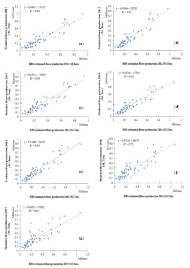 Finally, the accuracy assessment of the Boro production forecasting model was performed with statistical tools (Equations (1)–(3)) described mathematically by [84] which was used in relevant studies [83]. The regression model based estimated crop statistics from BCP Model-2 during 2011–2017 was assessed with statistical parameters MBE and RMSE presented in Figure 6. Besides, Figure 7 also reveals strong relationships between the predicted and estimated value for the Boro crop in Bangladesh as the R2 value at yearly scale ranges from 0.64–0.85 over 2011–2017. The MBE for the applied Boro forecasting model ranges from (−29,881 to 19,431) M.Ton which reveals that the applied model underestimates the Boro production in 2012, 2013, 2015, and 2016 whereas the overestimation have been found in 2011, 2014, and 2017 as the positive MBE gives the average amount of overestimation in the calculated value and vice versa [84]. The RMSE value for the applied model ranges from (5238–11,852) M.Ton, which is a positive value and also the use of RMSE in model validation has been appreciated by [83,85]. Model Efficiency (ME) is used to assess the potentiality of the model and in this study the ME ranges from (0.86–0.94) for the applied Boro crop forecasting model. The relevant literature suggests that an ME of 1 is a perfect match of modeled data to the forecasted data and essentiality the closer the ME is to 1, the more accurate the model is [86]. Hence the present ME over the period of (2011–2017) shows potentiality for using this model for Boro crop production forecasting at country scale. Therefore, the MBE, RMSE, and ME values in this study indicate close prediction results for Boro crop forecasting estimates during 2011–2017 for Bangladesh (Table A2). Regardless of strong relationship between the forecasted and estimated Boro production, it would be meaningful to note that the model-based forecasting may be affected by unexpected weather condition [86,87].