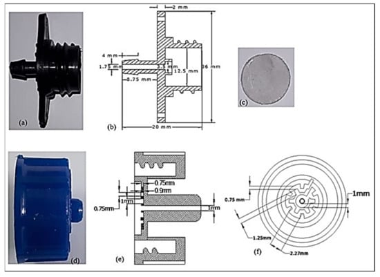 View of emitter properties and cross sectional view with leveling: (a) upper part of emitter and (b) cross section of the upper part, (c) silicon rubber washer, (d) lower part of the emitter, (e) cross section of the lower part, and (f) cross section of the labyrinth.