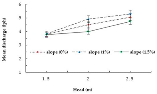 Emitter mean discharge rates for each operating pressure (head) with various slopes. Bars indicate the error percentage (5%).