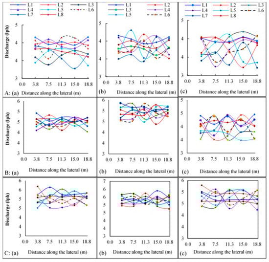 Emitter discharge rates along the lateral length at different operating pressures with various slopes, (A) 1.5 m operating pressures with (a) 0%, (b) 1%, and (c) 1.5% slope; (B) 2.0 m operating pressures with (a) 0%, (b) 1%, and (c) 1.5% slope; and (C) 2.5 m operating pressures with (a) 0%, (b) 1%, and (c) 1.5% slope.