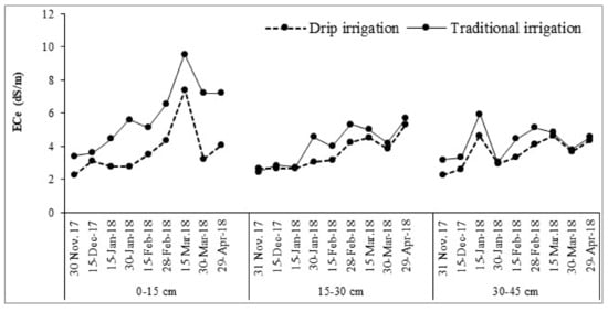Variations of soil salinity dynamics expressed as ECe of soil solution (EC1:5) over the soil profile during the crop growth season of 2017–18, at the saline area.