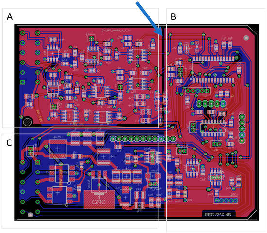 Figure 1, where the arrow points out the separation between the copper flood-fills (red layer) that form the voltage power planes on the top side of the PCB. Specifically, in section A, the top copper-filled areas (red layer) form the analog 3.3 V power rail and, in section B, the copper-filled areas provides the digital 3.3 V power rail. Section C has no copper-filled power plane due to the density of the component placement.