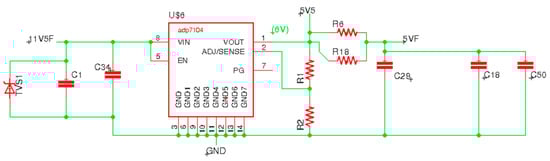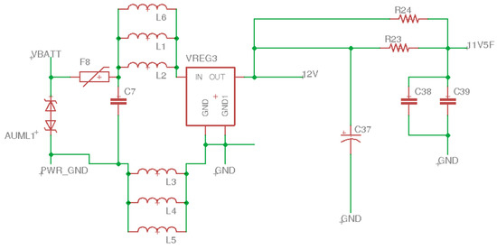 Table 1. The AUML varistor provides 50 joules of load dump protection to the system and provides the additional protection to the circuit by clipping any high-speed voltage input spikes to no more than 40 V. The next component in the protection chain F8, a resettable fuse, which helps protect against longer-duration load dump spikes. Next in the chain is a set of voltage spike rejection inductors that are placed to block spikes on both the power and ground rails leading into the first stage linear voltage regulator, VREG3. This first-stage regulator was designed around the a linear voltage regulator chip, LM2940 (Texas Instruments, Austin, TX, USA), as it is rated for vehicular applications and provides protection against reverse battery jumps and is rated for an absolute maximum voltage input to 60 V, which is well above the voltage clipping threshold provided by the AUML and the resettable fuse protector.