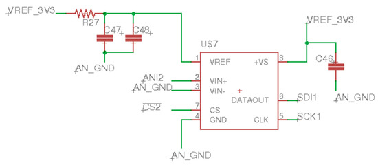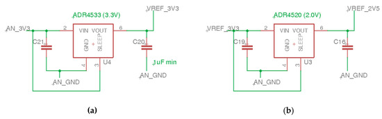 As noted in the previous section, the regulated voltage is provided to the analog subsection by a pair of very low-noise precision high-accuracy voltage reference sources, ADR453x (Analog Devices, Norwood, MA, USA). The ADR453x series of voltage references provides both exceptional voltage accuracy and stability. They feature one of the lowest noise specifications (1 µVpp) that were currently available for a linear voltage regulator at the time of this design. This pair of voltage references (ADR4520, ADR4533), which are detailed in