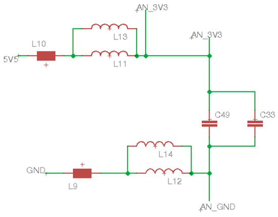 Figure 7 shows the input to the analog voltage reference section where the 5.5 V is brought in through noise rejection inductors and capacitors. Corresponding component values for the schematic shown in