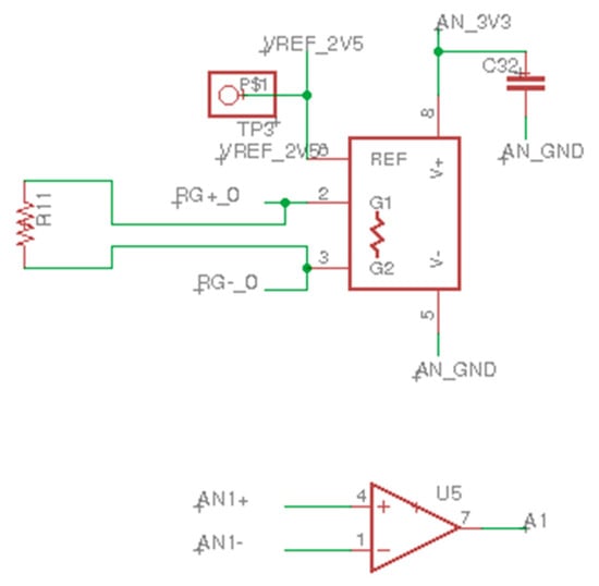 Figure 8) (AD8226; Analog Devices, Norwood, MA, USA) to convert the differential mV signal from the pressure sensor into a high 1 Vpp signal to the filtering stages. Corresponding component values for the schematic shown in