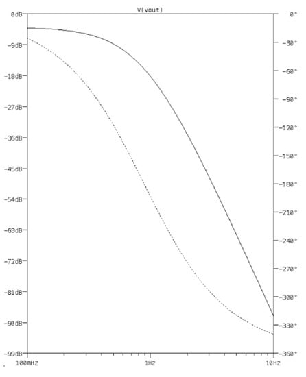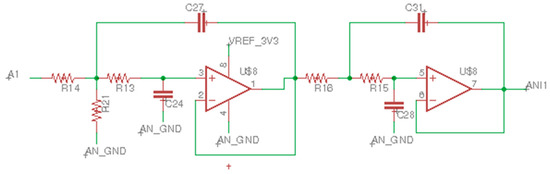 22]. The combined output of these filters provides a corner frequency with the design set to below 1 Hz, as the DC steady-state value is the only reading of interest to the application. Corresponding component values for the schematic shown in