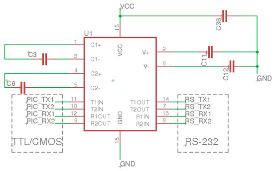 Figure 12 details the RS232 voltage level shifter circuit that was used to convert the micro-controller 3.3 V level serial signals to more robust long distance transmission signaling standard, −12 V to +12 V, that is utilized in the RS232 hardware specification and design. Corresponding component values for the schematic shown in