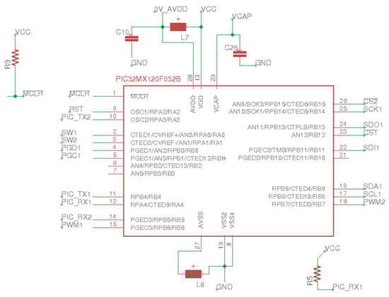 A high-speed 32-bit micro-controller was selected for the design due to the high-speed digital filtering and feed-back control operation desired in the design. As Microchip produces a low 28-pin count version in an easy-to-assemble surface mount form factor, a Pic32MX120F032B (Microchip, Chandler, AZ, USA) was selected for this design (see