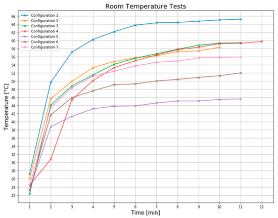 Temperature vs. time plots of LED configurations for room temperature tests.
