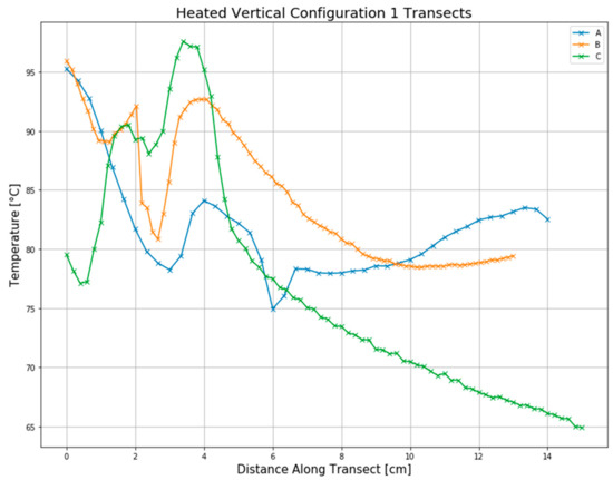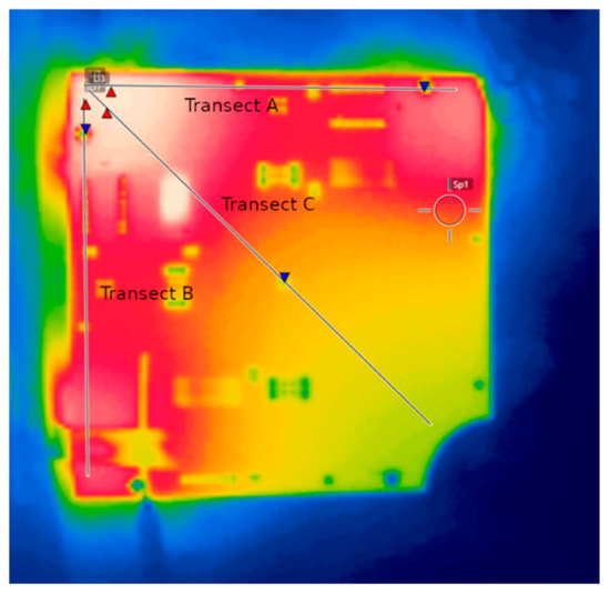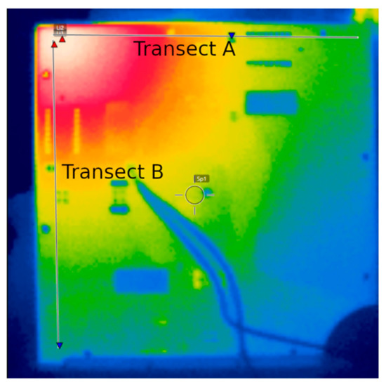 A thermal infrared temperature image captured for the heated room test, configuration 1, at the final time value (PCB in vertical orientation) is shown in Figure 9. Of note are the highly localized hotspots, again indicating poor heat transfer by the inner metal-core of the double-sided MCPCB. A plot of temperatures across the transects for this test is shown in Figure 10.