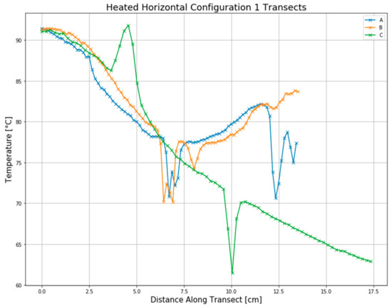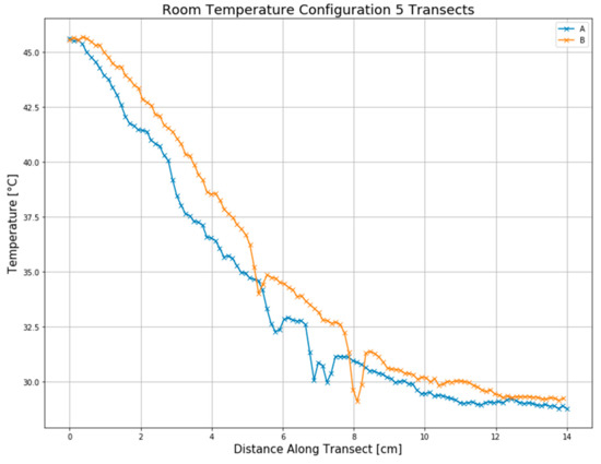 Infrared temperature transects, from Figure 4, for 20 °C room temperature test, configuration 5, snapshot shown at time, t = 11 min.