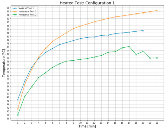 Figure details the hottest location on the printed-circuit-board’s temperature vs. time for the room heated tests, for configuration 1, in both horizontal and vertical orientations of the circuit-board.