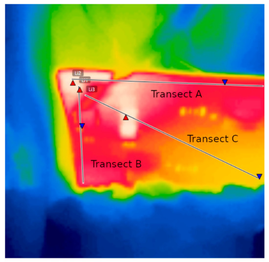 A thermal infrared temperature image captured at the final time value of the heated-room test for configuration 1 is shown in Figure 7, and a plot of the infrared image temperatures across the transects is shown in Figure 8. Of note again are the highly localized hotspots near the LED heat sources, indicating an insufficiency of the double-sided MCPCB to off-load heat from the LED sources to the cooler regions of the MCPCB.