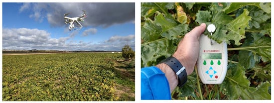 In line with aforementioned studies, the aim of the research presented herein was to verify the validity of such methodologies based on index calculation from the RGB bands of leaf images (obtained using a non-scientific-grade camera) for chlorophyll content evaluation in sugar beet leaves during the final growth stage. For this validation, in a first step, different size and color sugar beet leaves from commercial farms were collected and photographed in the laboratory, extracting RGB values. Twenty-five indices proposed in the literature were tested, and nine novel indices were proposed. In a second step, the best indices were tested in field conditions, comparing conventional chlorophyll-meter measurements with the values estimated using UAV-taken photographs of a sugar beet plot.